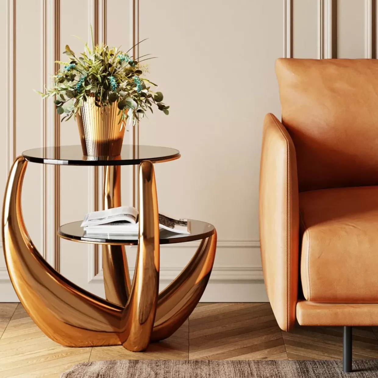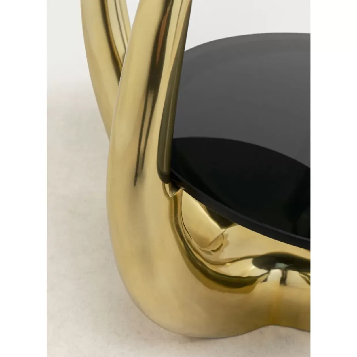 - Goldener Beistelltisch Aus Metall Mit 2 Runden Tischplatten Aus Dunkel Gefarbtem Glas