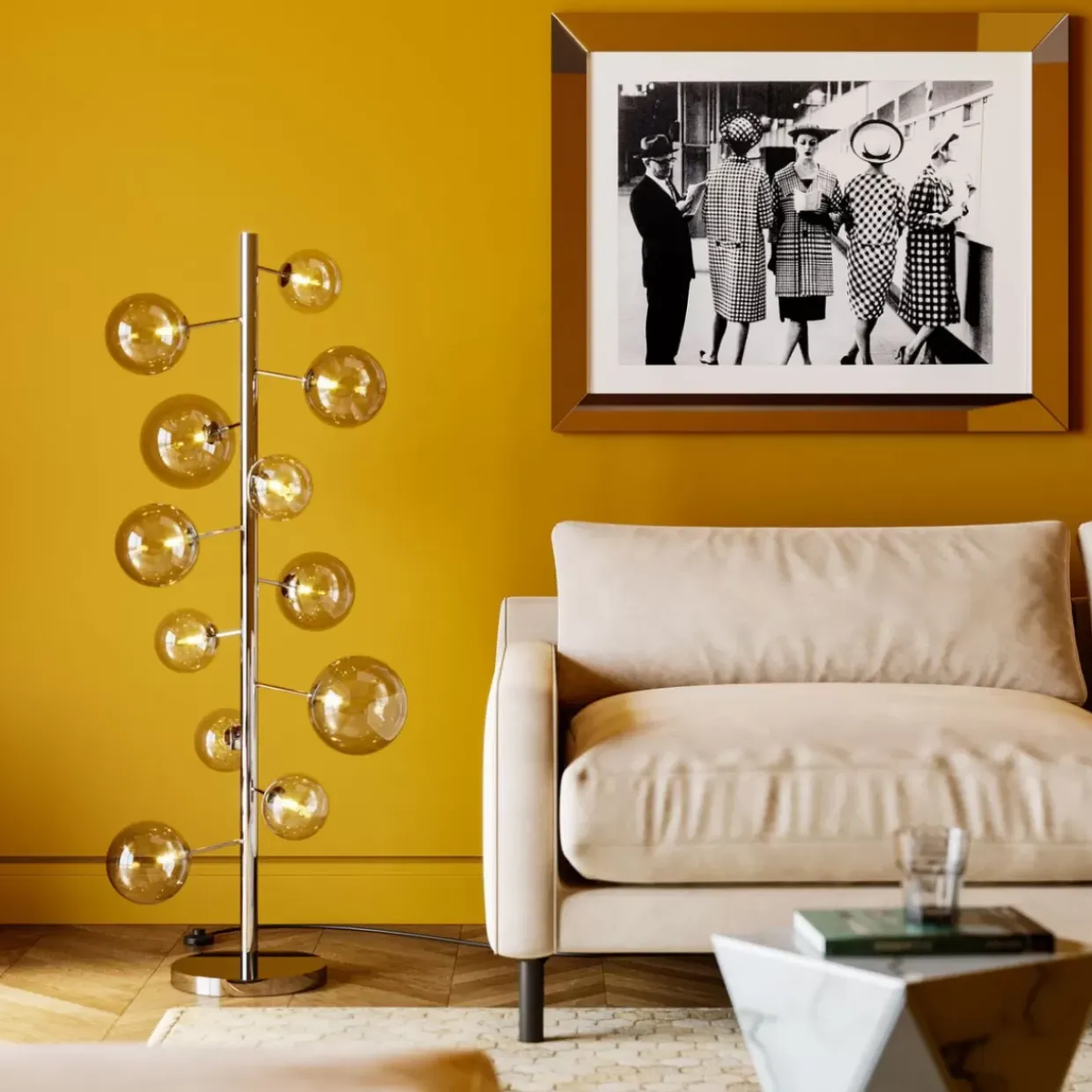- Grose Stehleuchte Mit Leuchtkorpern Aus Unterschiedlich Grosen Kugeln Aus Gefarbtem Glas
