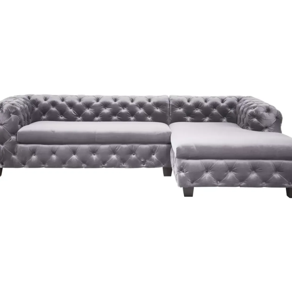 - Groses,Graues Ecksofa Im Chesterfield-Stil Mit Einem Samtig Schimmernden Bezug Und Schwarzen Fusen Aus Massivholz