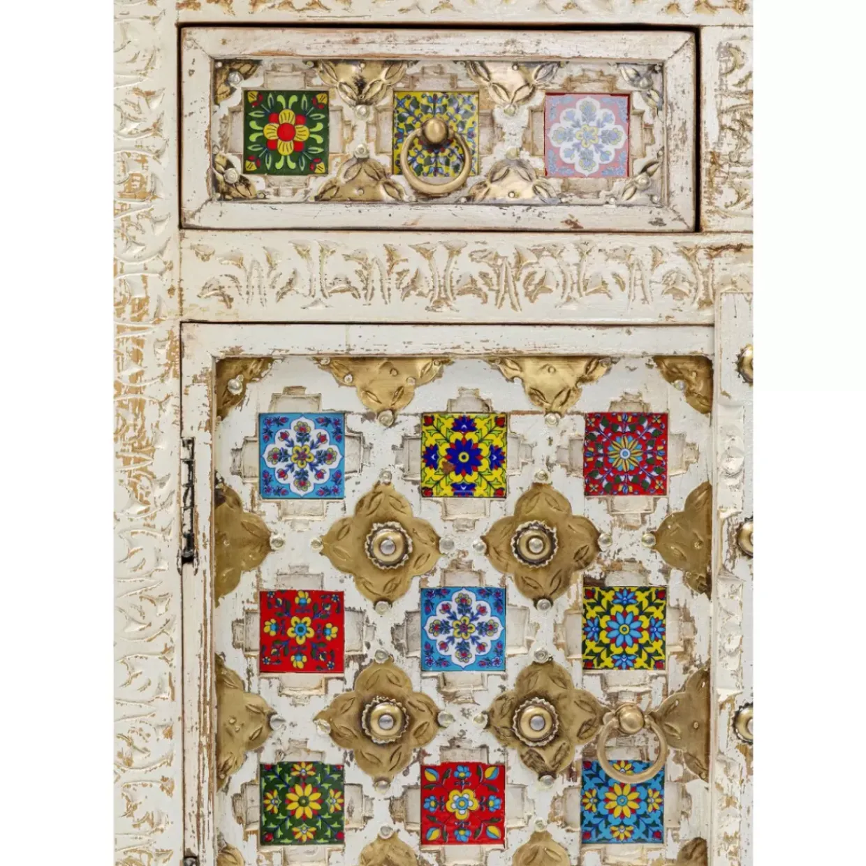 - Massivholz-Kommode Mit Aufwandigen Schnitzereien,Messingfarbenen Metallverzierungen Und Bunt Gemusterten Kacheln