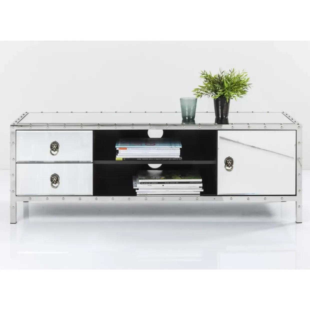 - Tv-Board Mit Spiegelglas-Verkleidung Und Facettenschliff,Stahl-Gestell,Deko-Nieten,Zwei Schuben,Einem Einlegeboden Und Kabeldurchlass Hinten