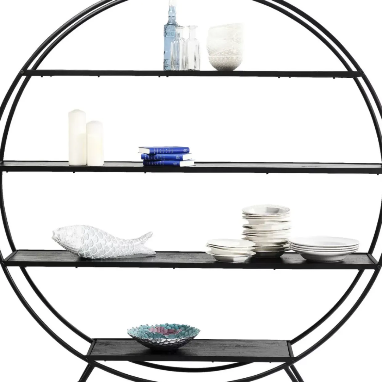 - Groses,Rundes Regal Aus Schwarz Lackiertem Stahl Mit Regalboden Aus Massivholz
